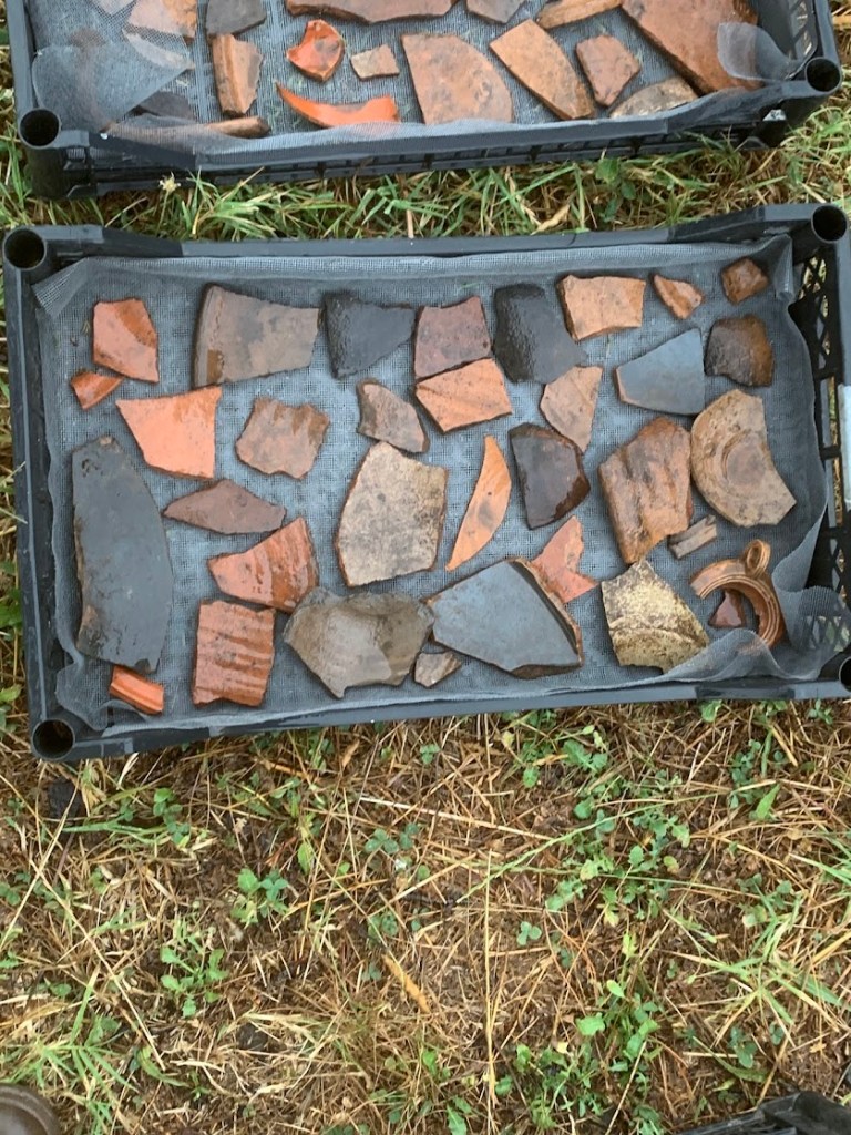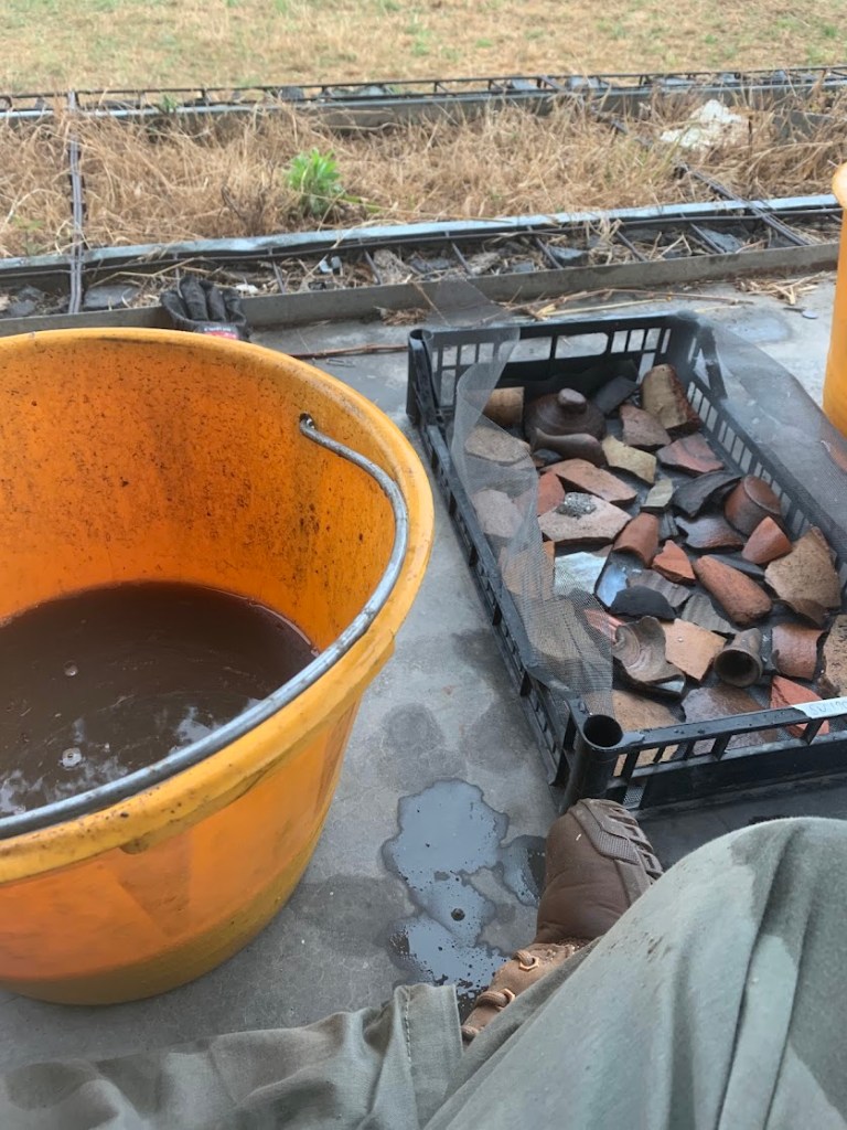 Week 2 was a mix of chaos and calm. On Tuesday, we found ourselves cleaning several crates of ceramics as it poured outside. The rain created a soothing backdrop, contrasting sharply with the intense sun we experienced in the trenches. It was nice to listen to the rain and thunder as I washed pottery and saw the different designs on different pieces. This week highlighted the diverse nature of archaeological work, where tasks can range from the physically demanding to the carefully delicate, each contributing to the broader understanding of our findings.