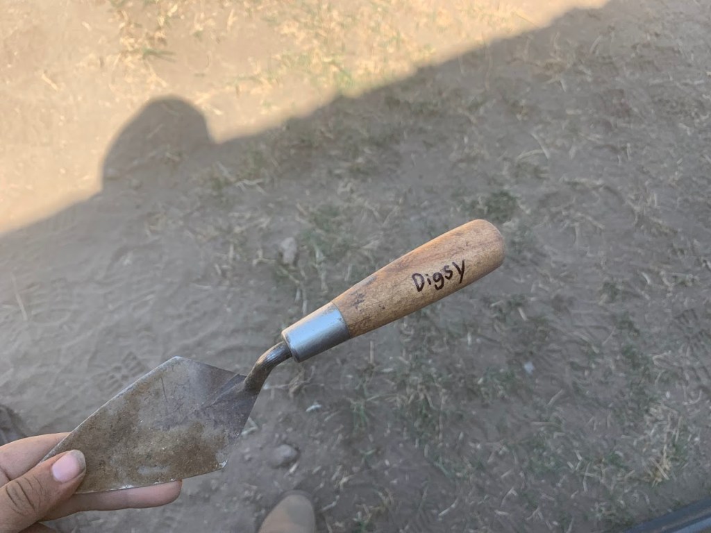 Now we could begin excavating. I was very excited to start and finally use my personal trowel, affectionately named Digsy. We started by carefully removing dirt with gentle swipes, ensuring we didn’t miss any changes in soil, small artifacts, or other points of interest.