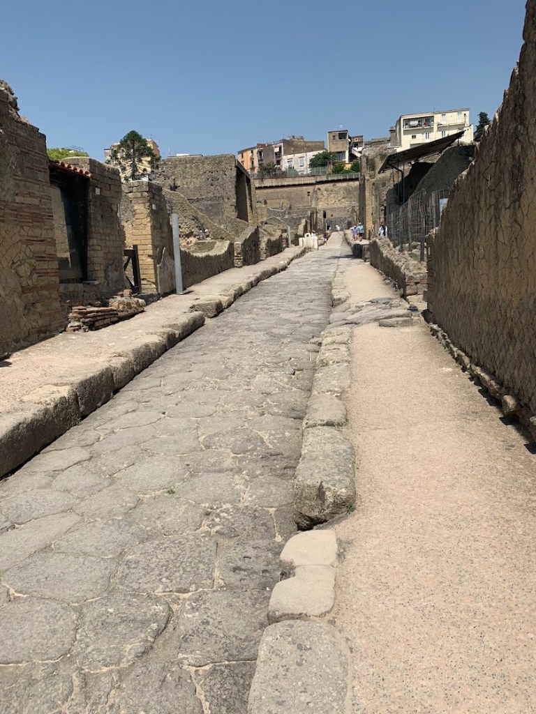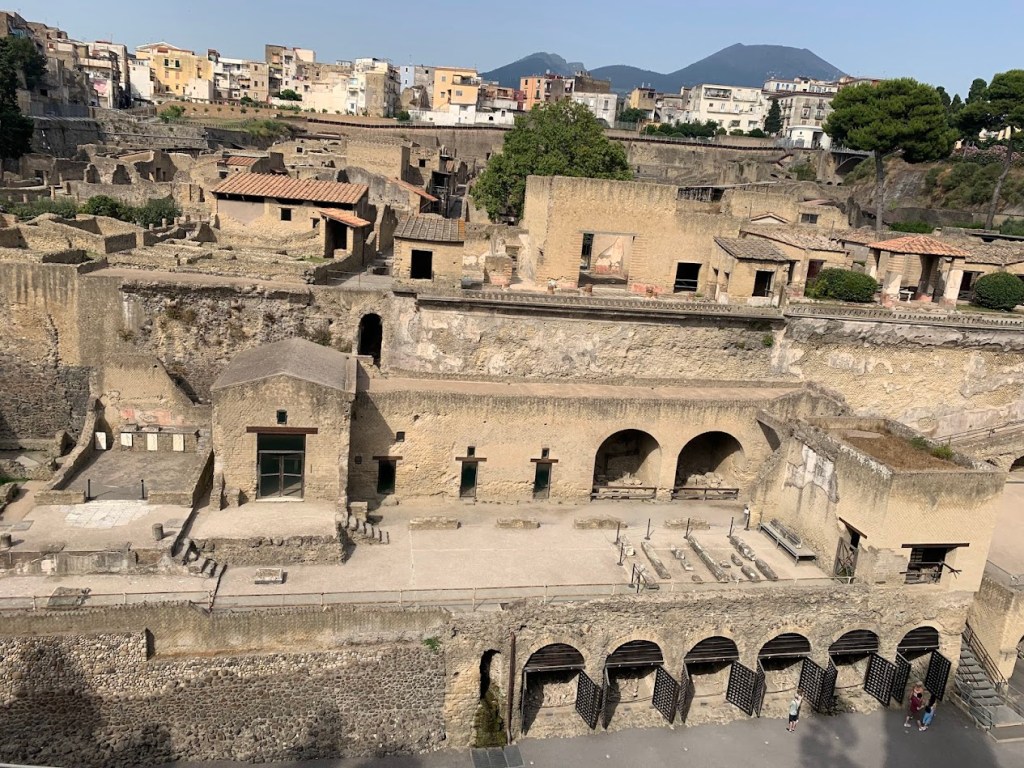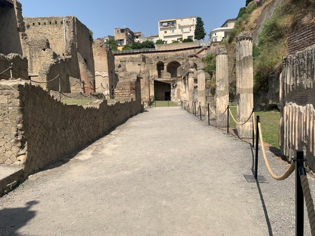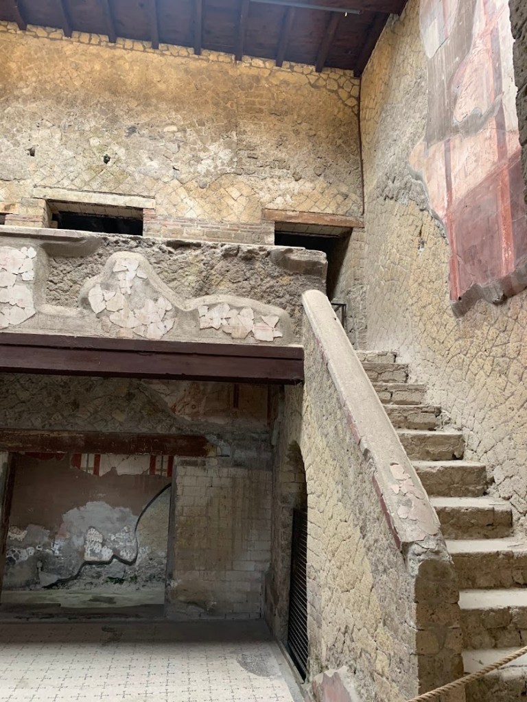 Complete with painted columns, frescoes, second floors and marble panels, Herculaneum does not disappoint any visitor. Visiting Herculaneum was a remarkable experience, similar yet different from Pompeii. Herculaneum was a smaller, wealthier town that was also buried by the eruption of Mount Vesuvius in 79 CE. The site offers a unique glimpse into Roman life, preserved under layers of volcanic material that kept the city remarkably intact. The preservation of organic materials, such as wood and food, offers an unparalleled view into the daily lives of its inhabitants.