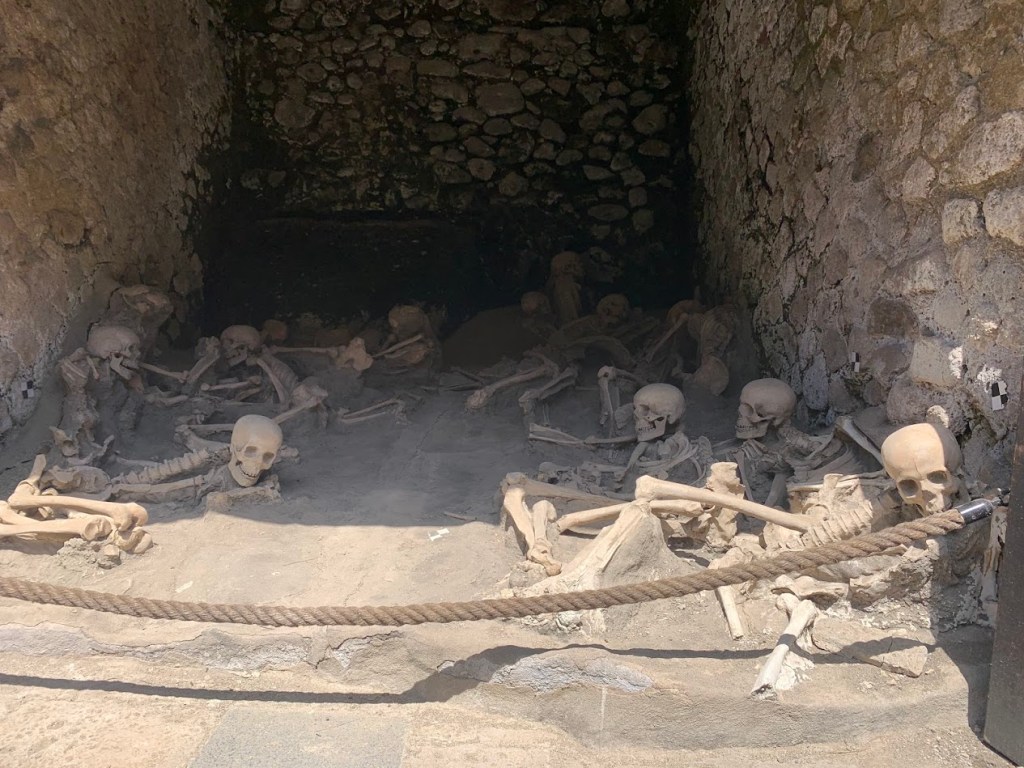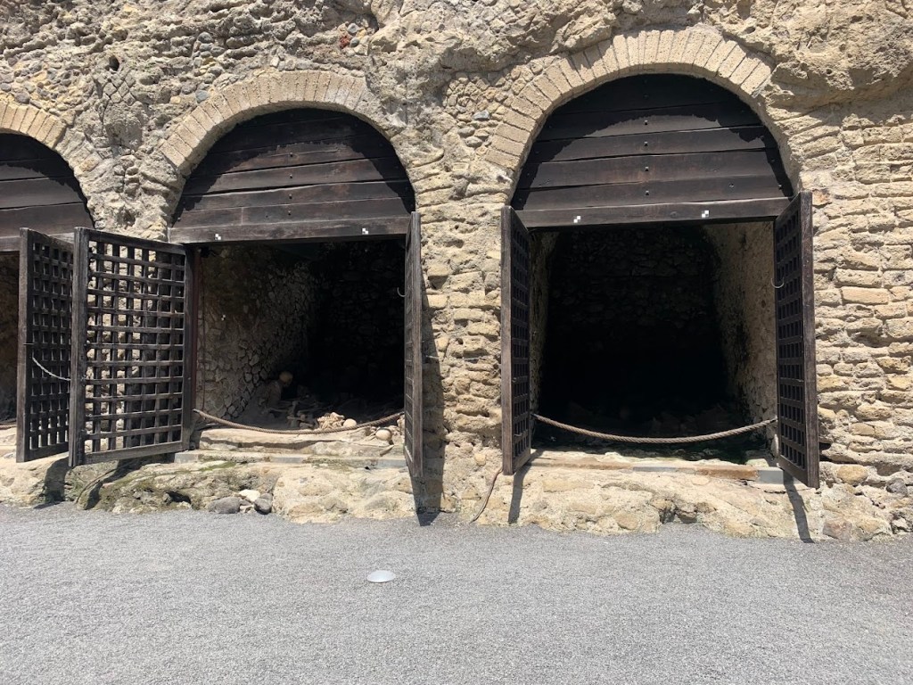 Walking into Herculaneum, one of the first areas you come across are the boat houses. The boat houses are undoubtedly the most powerfully affecting area of the site. They are filled with the skeletons of those who tried to shelter there from the volcanic eruption, and they are preserved so well that you can make out people’s positions, such as parents holding children. It’s a heart-breaking and sobering sight, and it enables you to imagine their lives in the town and the terror of the eruption like nothing else could.
