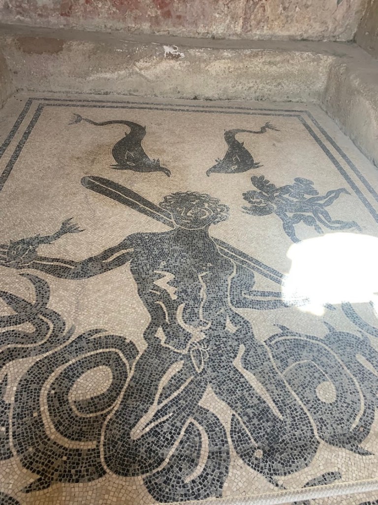 The baths of Herculaneum were another highlight of my visit. The Suburban Baths, located near the ancient shoreline, were incredibly well-preserved, with intact mosaics, frescoes, and even wooden doors. I was shocked that I was allowed to walk on the detailed mosaics in a nautical theme, made entirely out of black and white pieces.